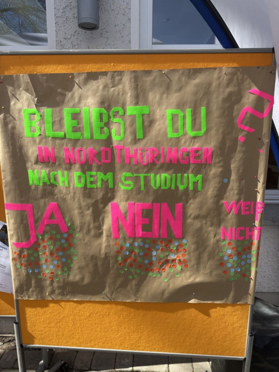 Nordhausen. Das Projekt WORT Nord ist Anfang April erstmals sichtbar auf dem Campus der Hochschule Nordhausen aufgetreten. Mit einem großen Pavillon vor der Mensa und mehreren Pinnwänden wurde zum einen auf das Projekt aufmerksam gemacht und zum anderen Bleibeabsichten der Studierenden abgefragt. Insgesamt 185 Studierende beteiligten sich in der ersten Woche des Sommersemesters an dieser Kurzumfrage, die das Ziel hatte, ein erstes Stimmungsbild einzuholen. 66 Studierende antworteten, dass sie nach dem Abschluss in der Region verbleiben möchten, während 44 sich nicht sicher waren und 75 die Frage verneinten.