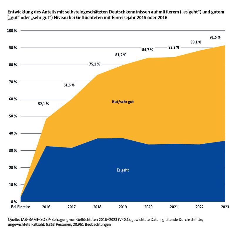 Wie gut sind heute die Deutschkenntnisse der Geflüchteten, die in den Jahren 2015 und 2016 nach Deutschland gekommen sind? Das Forschungszentrum des Bundesamtes für Migration und Flüchtlinge (BAMF-FZ) hat die Sprachkenntnisse von Geflüchteten untersucht und zieht in der BAMF-Kurzanalyse „Zehn Jahre in Deutschland“ eine positive Bilanz: Mehr als 90 Prozent der Geflüchteten aus diesen Jahrgängen verfügen heute nach eigenen Angaben über Deutschkenntnisse auf mittlerem, gutem oder sehr gutem Niveau.